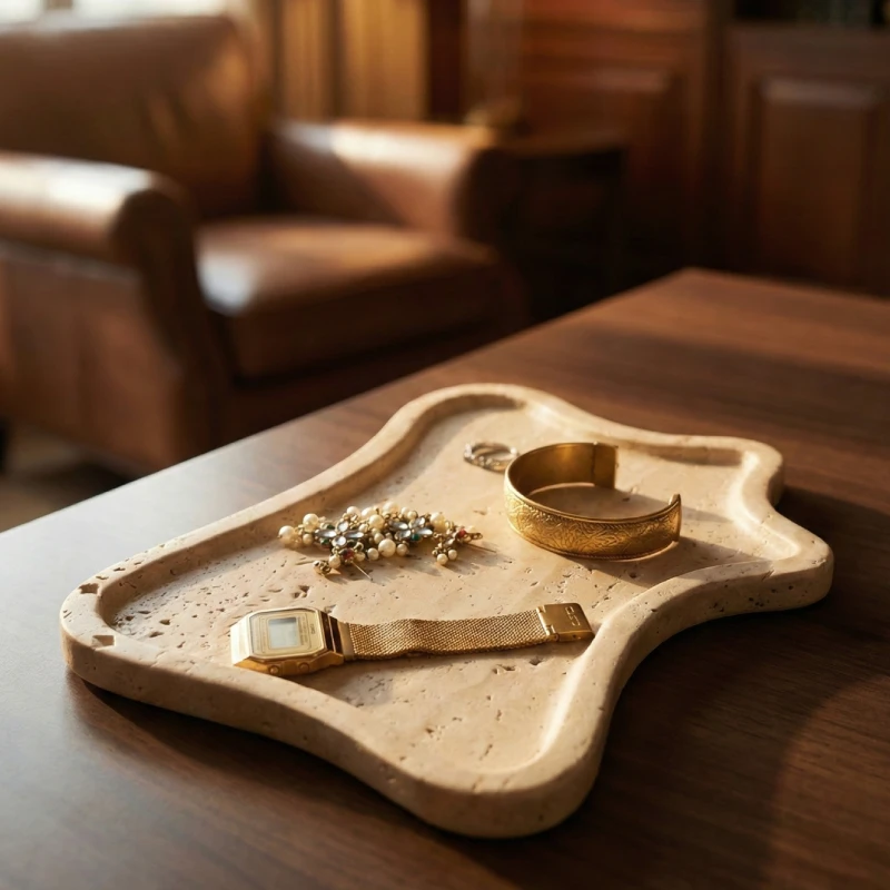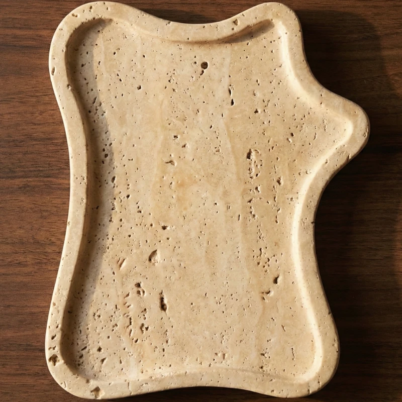 Carved from natural travertine stone, this sculptural tray blends organic texture with a soft, fluid silhouette. Each piece highlights the stone’s natural pores and tonal variations, making every tray subtly unique. Designed to elevate everyday surfaces—whether styled on a coffeetable, vanity, console, or bedside. Available in two practical sizes, this tray works equally well as a decorative accent or a functional organizer for jewelry, keys, fragrances, or essentials.