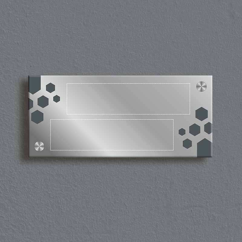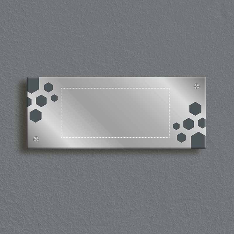 Elegant apartment nameplate crafted with premium stainless steel and sleek black glass. Featuring a modern hexagonal pattern and stylish font, this durable nameplate adds a touch of sophistication to your home entrance.